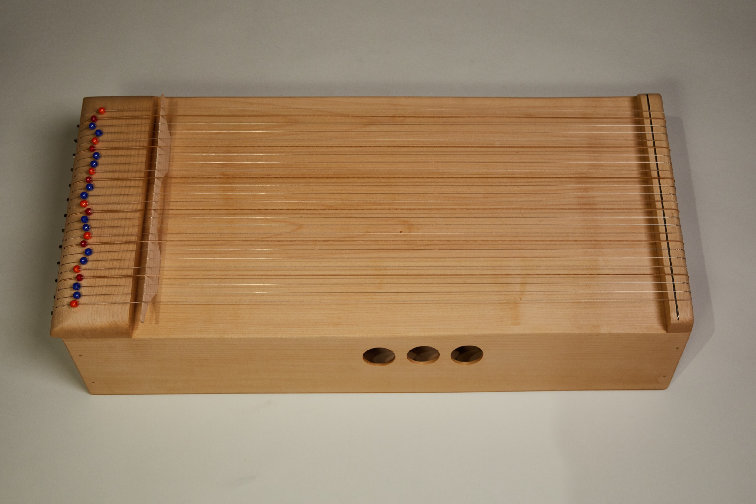 It has 40 strings in A tuning. The strings are tuned into the basic tone and its lower octave with the added D fifth and it has 4 extra melodic strings (on bridges) that can be tuned into minor or major pentatonics.